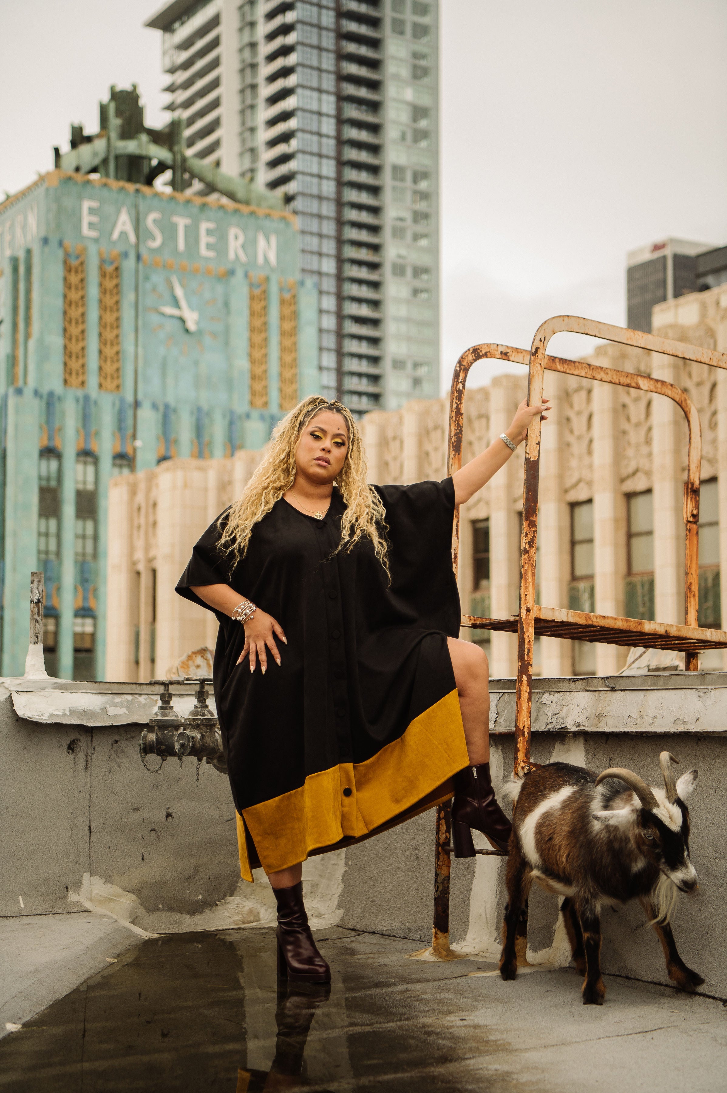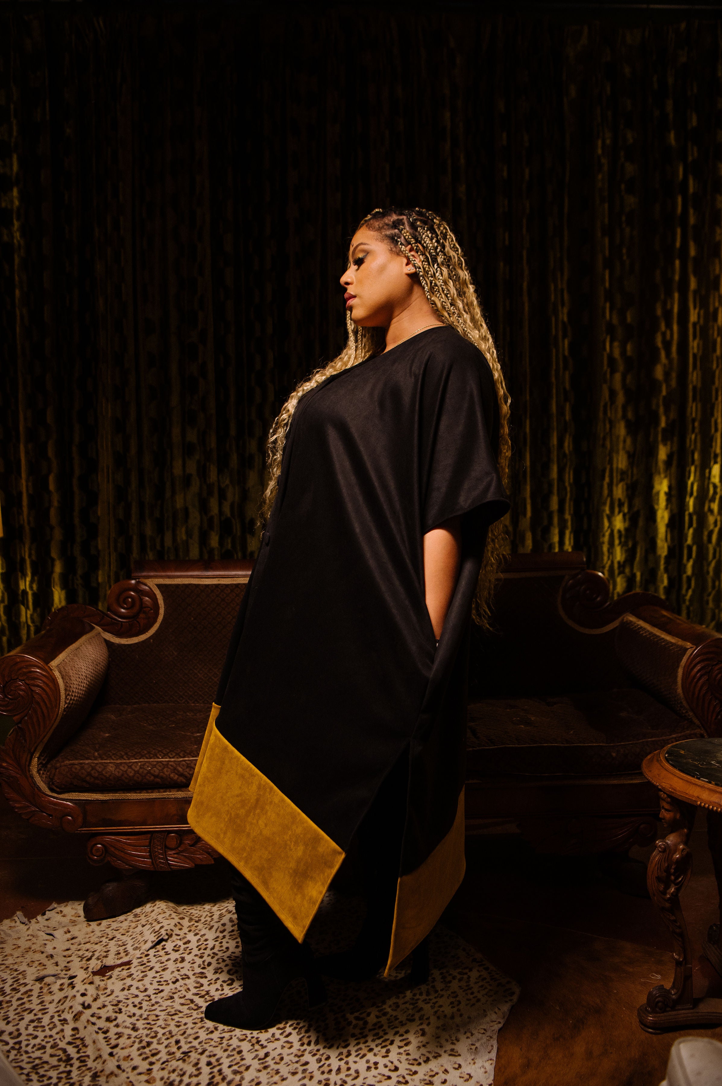 Queen Capricorn features a mustard faux suede body anchored with a bold black hem. Commanding and intentionally oversized. Weighted for the cooler months, finished with oversized buttons, and designed to move effortlessly from home to street. Cozy, elevated, and unmistakably Capricorn.