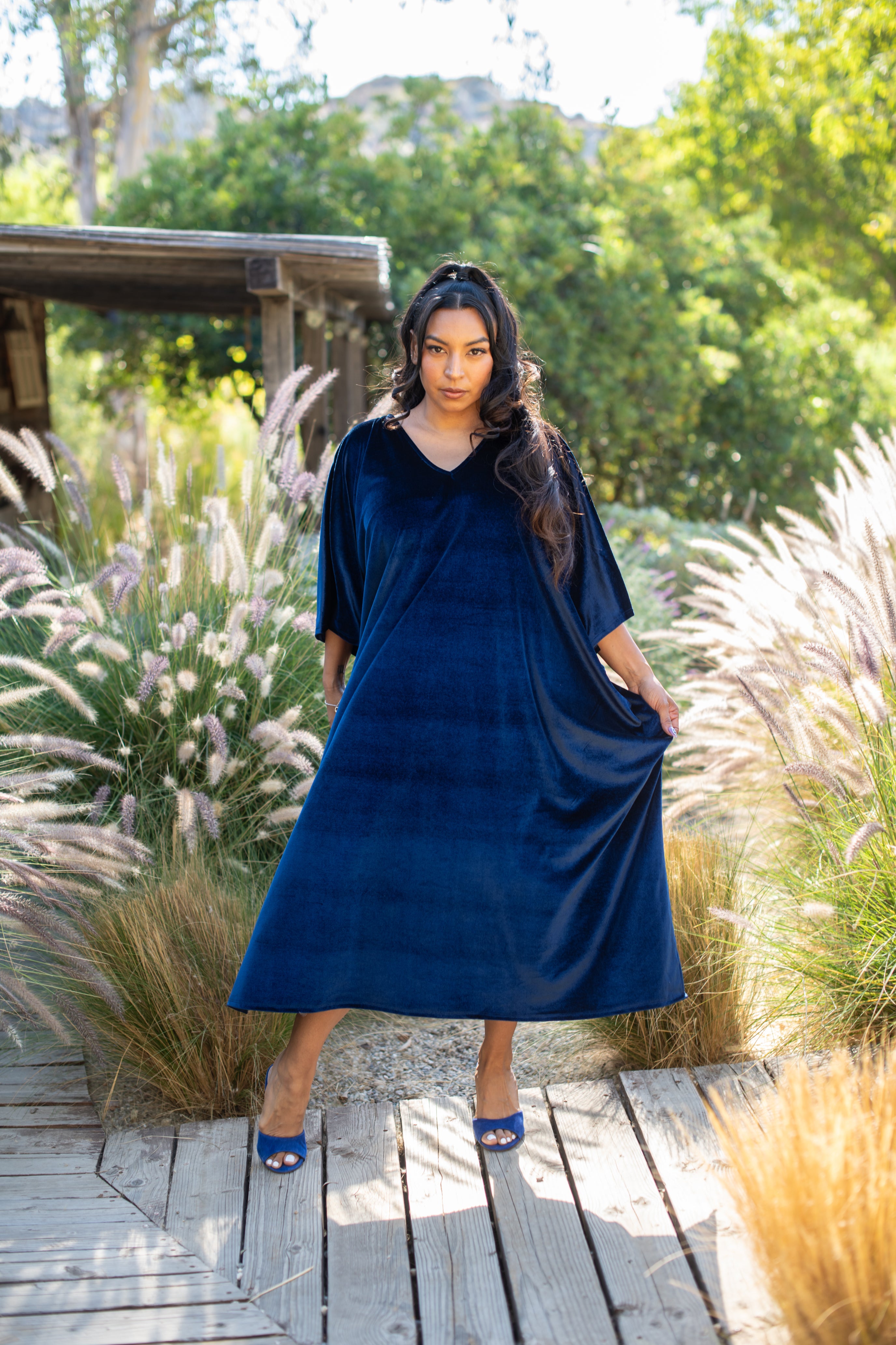 Embrace the allure of the night with "Midnight Love" Whether it’s for solo soirées or intimate rendezvous with a special someone - this deep blue muumuu is an invitation to your very own private party.