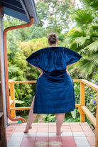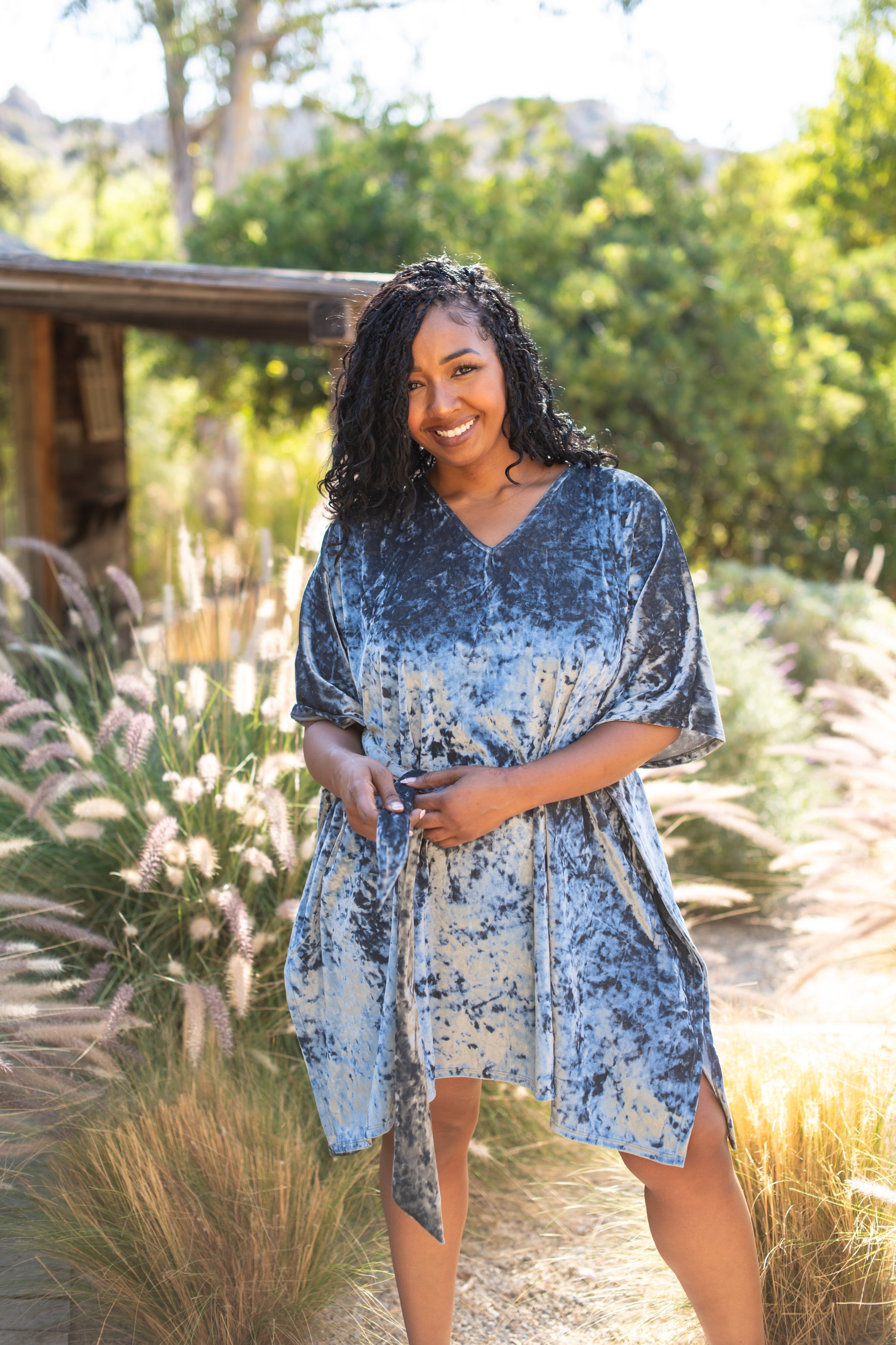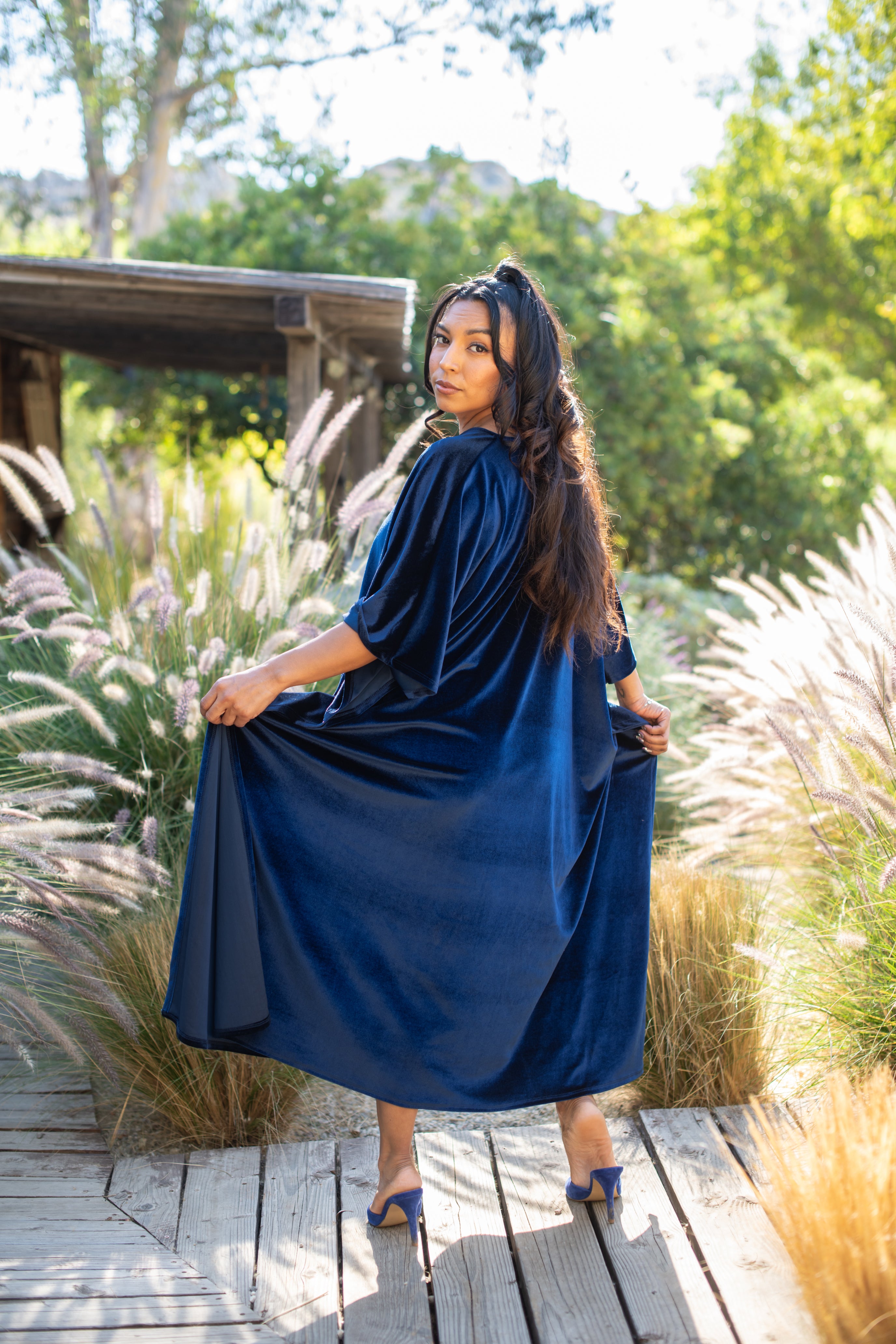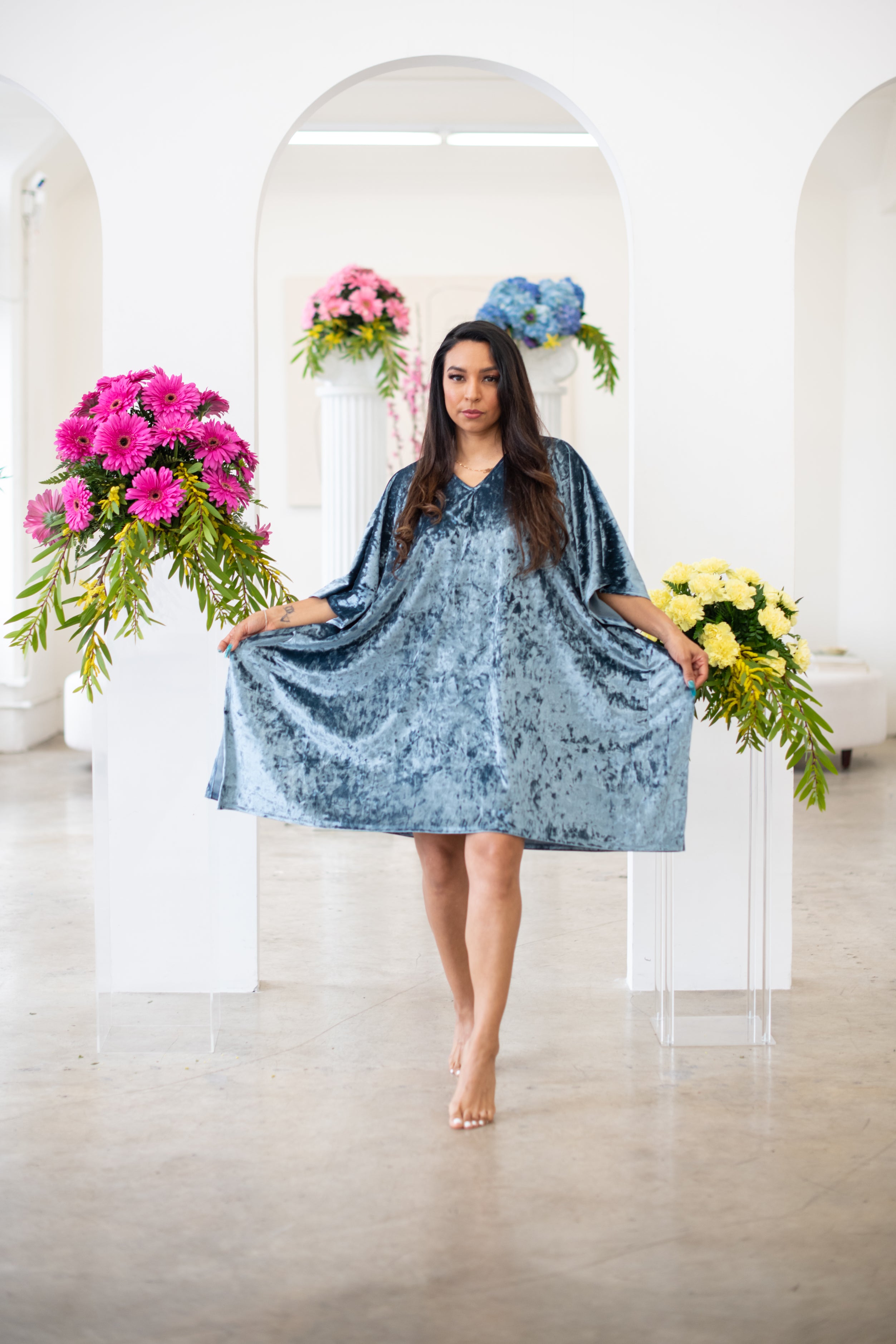Embrace the allure of the night with "Midnight Love" Whether it’s for solo soirées or intimate rendezvous with a special someone - this deep blue muumuu is an invitation to your very own private party.