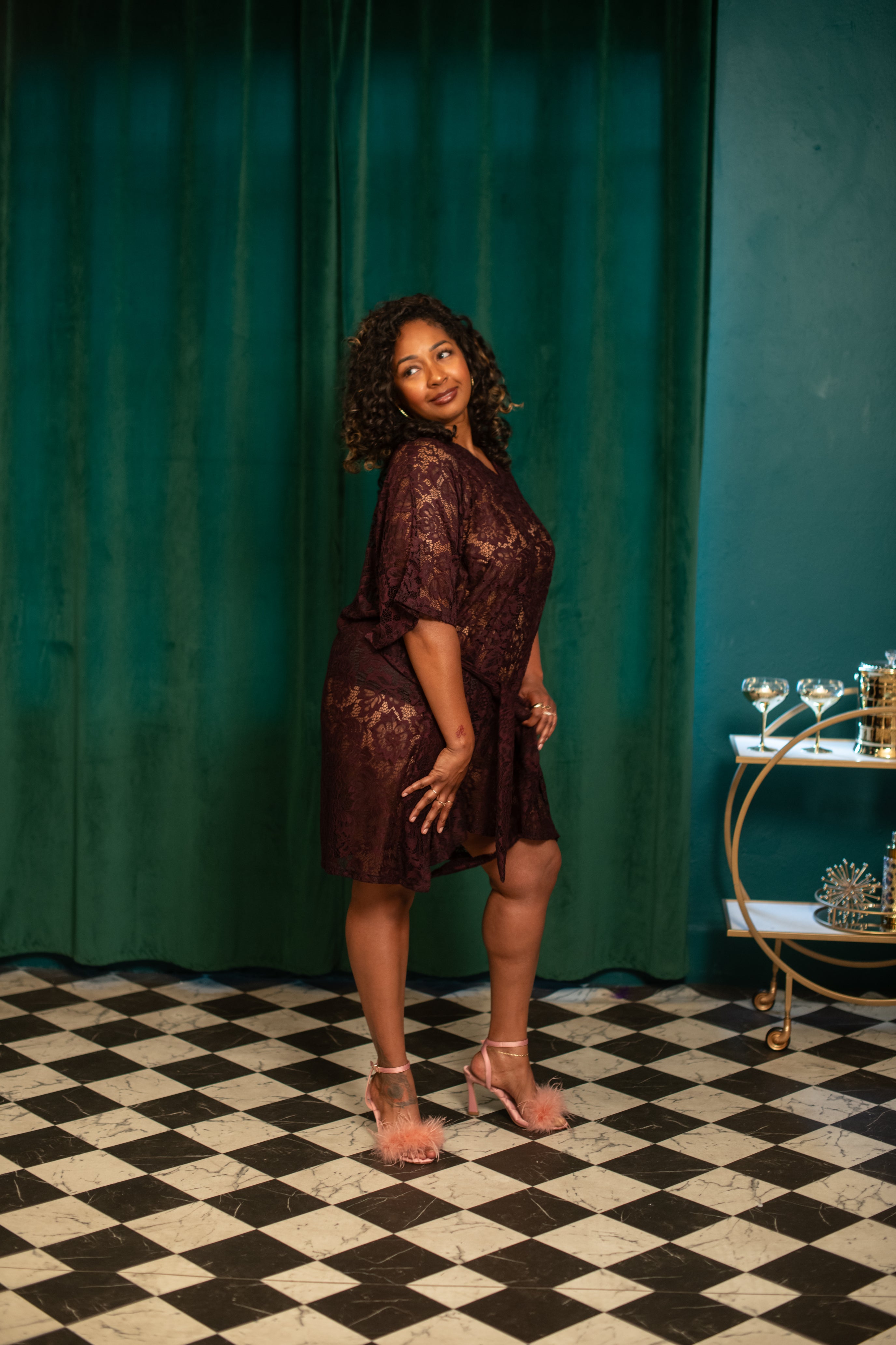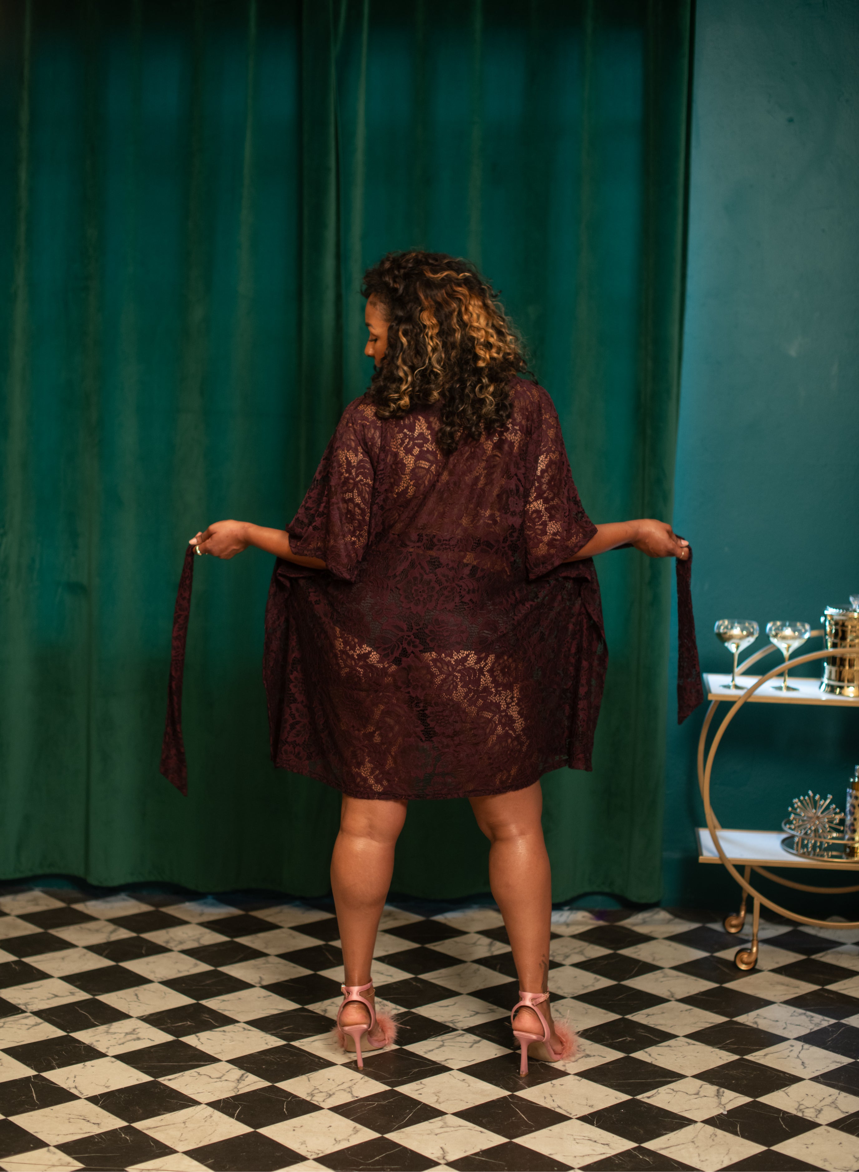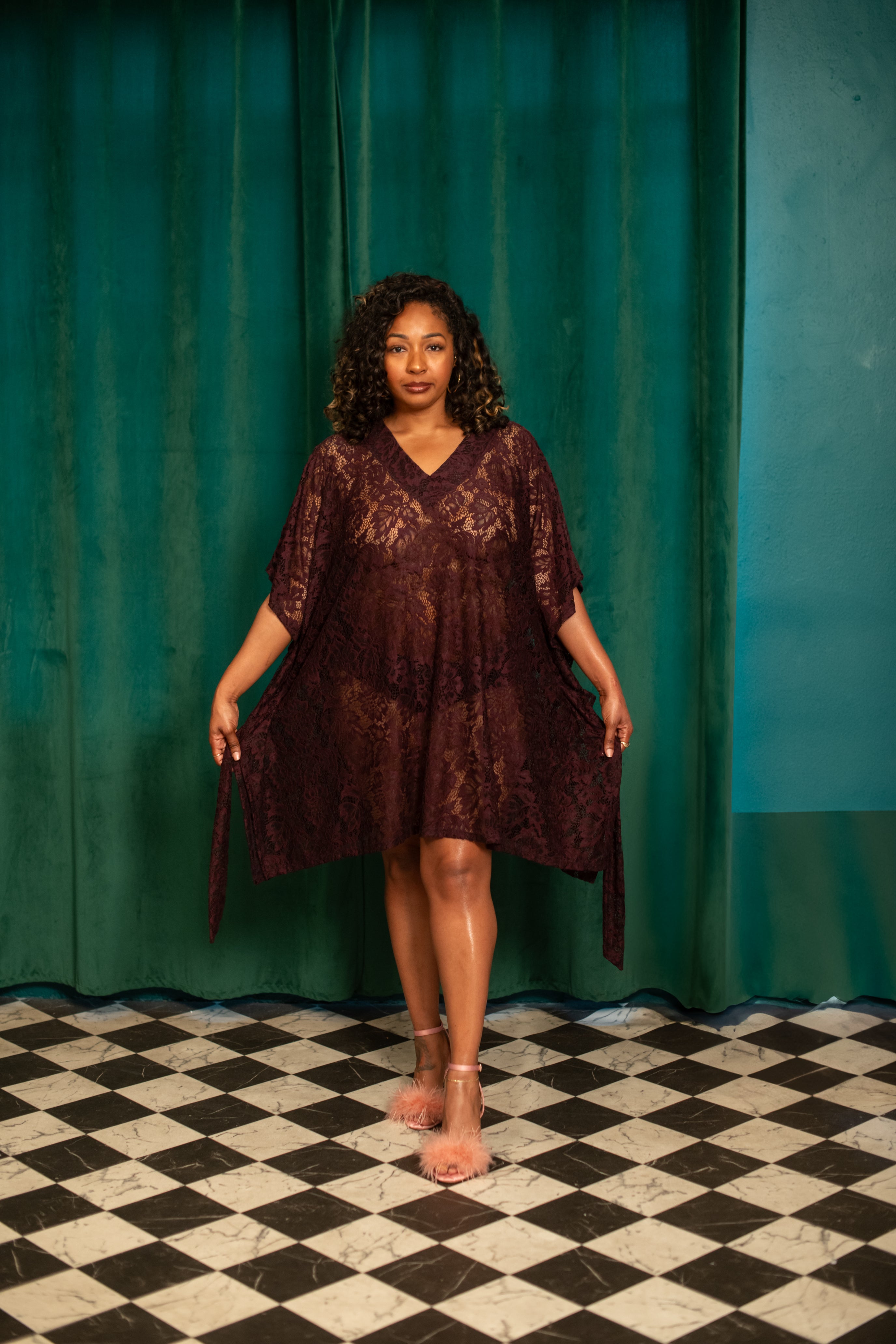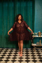 Black Orchid is romance in motion. This seductive sheer lace muumuu drapes effortlessly with a matching cloth belt that lets you switch up the vibe—cinch it for a sultry silhouette or to tie your ankles up…whatever you’re into, we don’t judge. Bold, flirty, and a little dangerous.