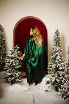 Step into Emerald Night, a luxurious hunter green satin muumuu that brings pure holiday enchantment. The long, flowing silhouette and dramatic ruffle arms create a look that feels regal, while the inside belt lets you draw the shape in for a softly defined waist or wear it free for effortless elegance. Rich, sleek, and made for festive nights, this piece turns every holiday moment into a celebration.