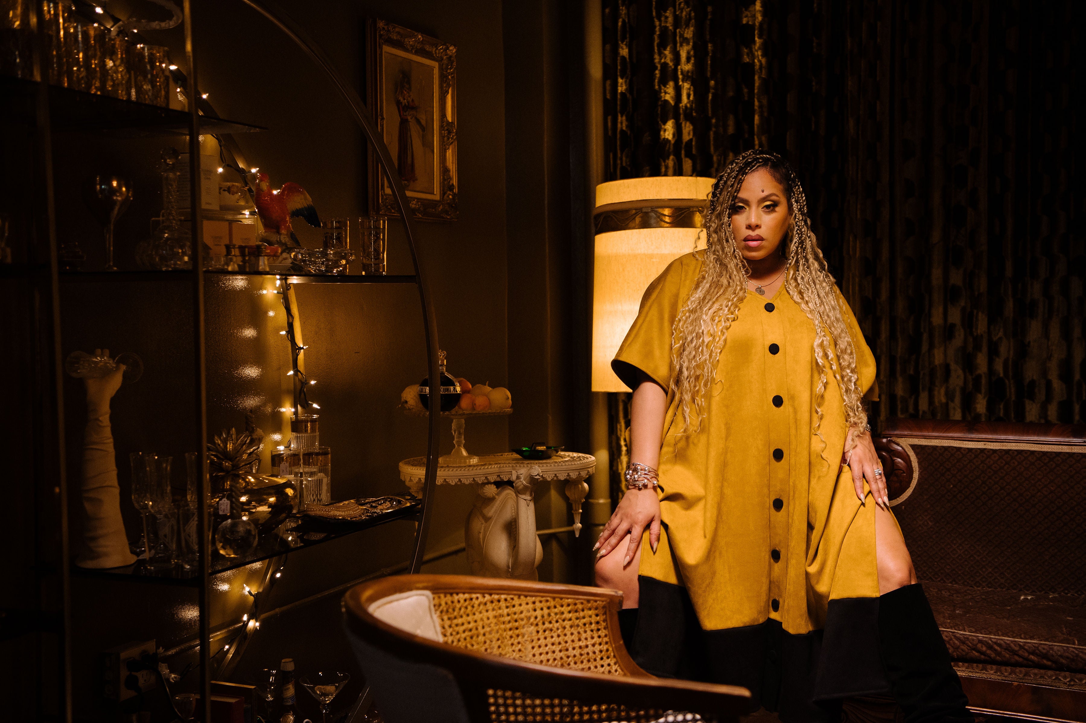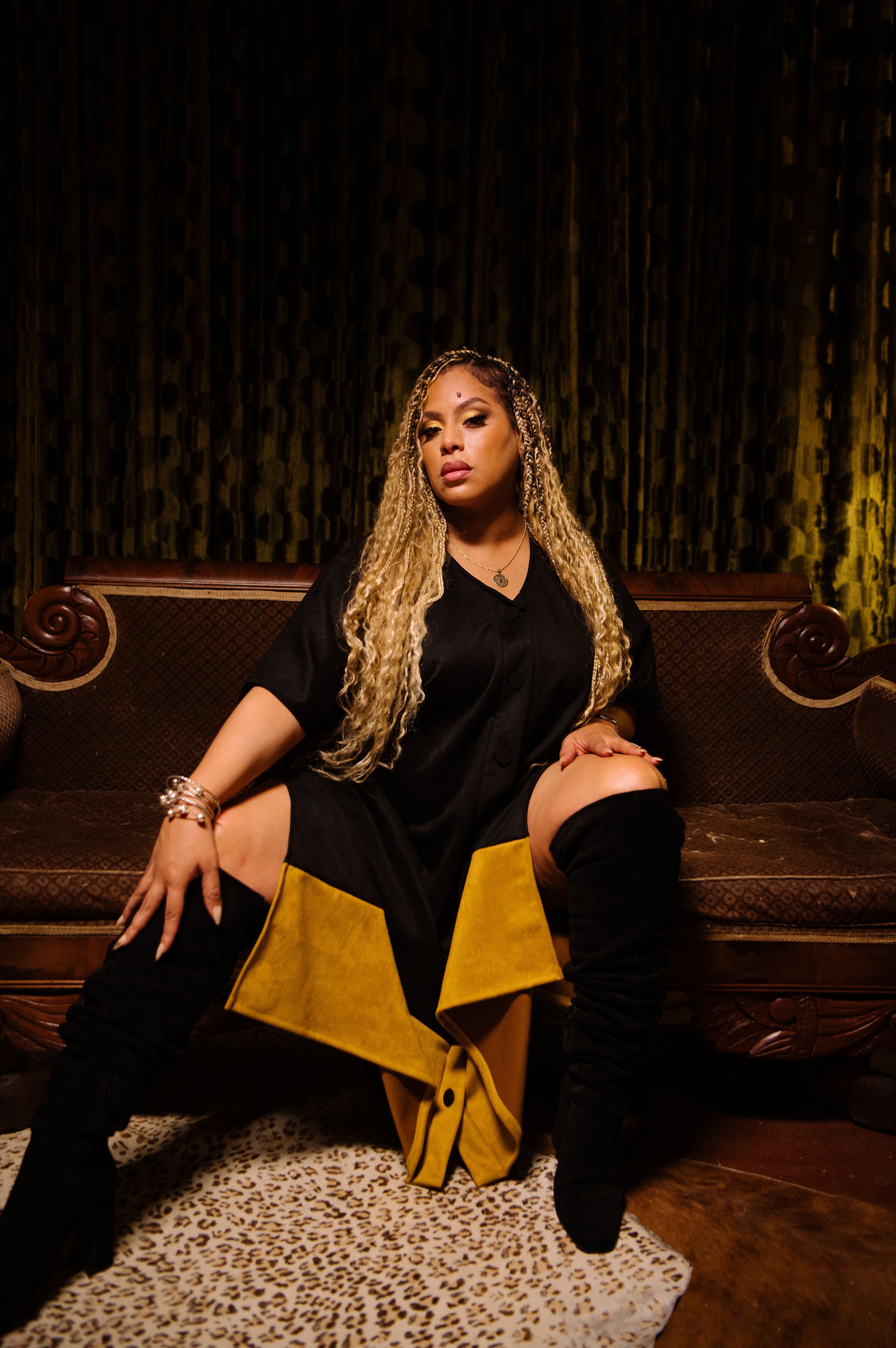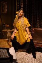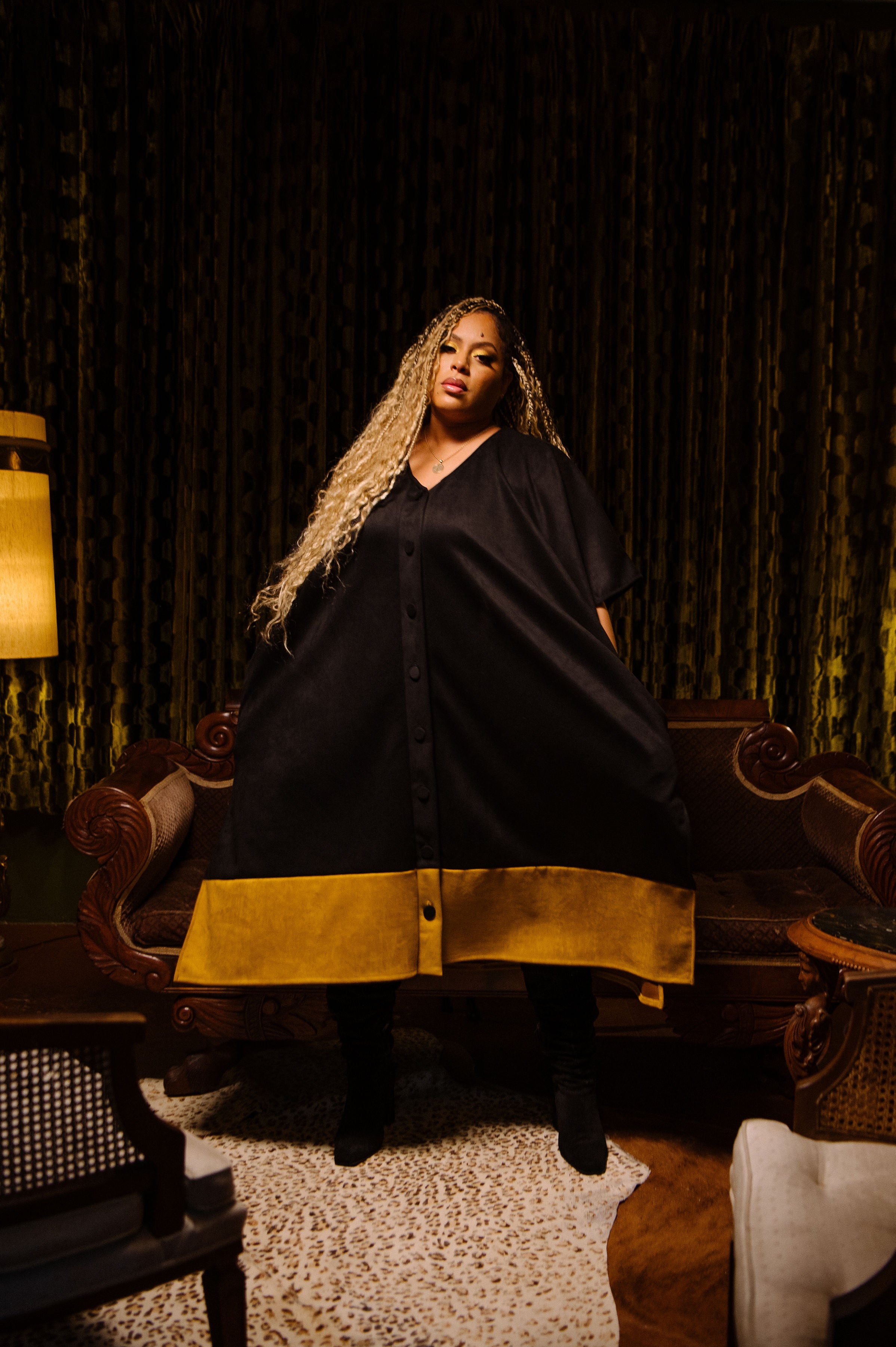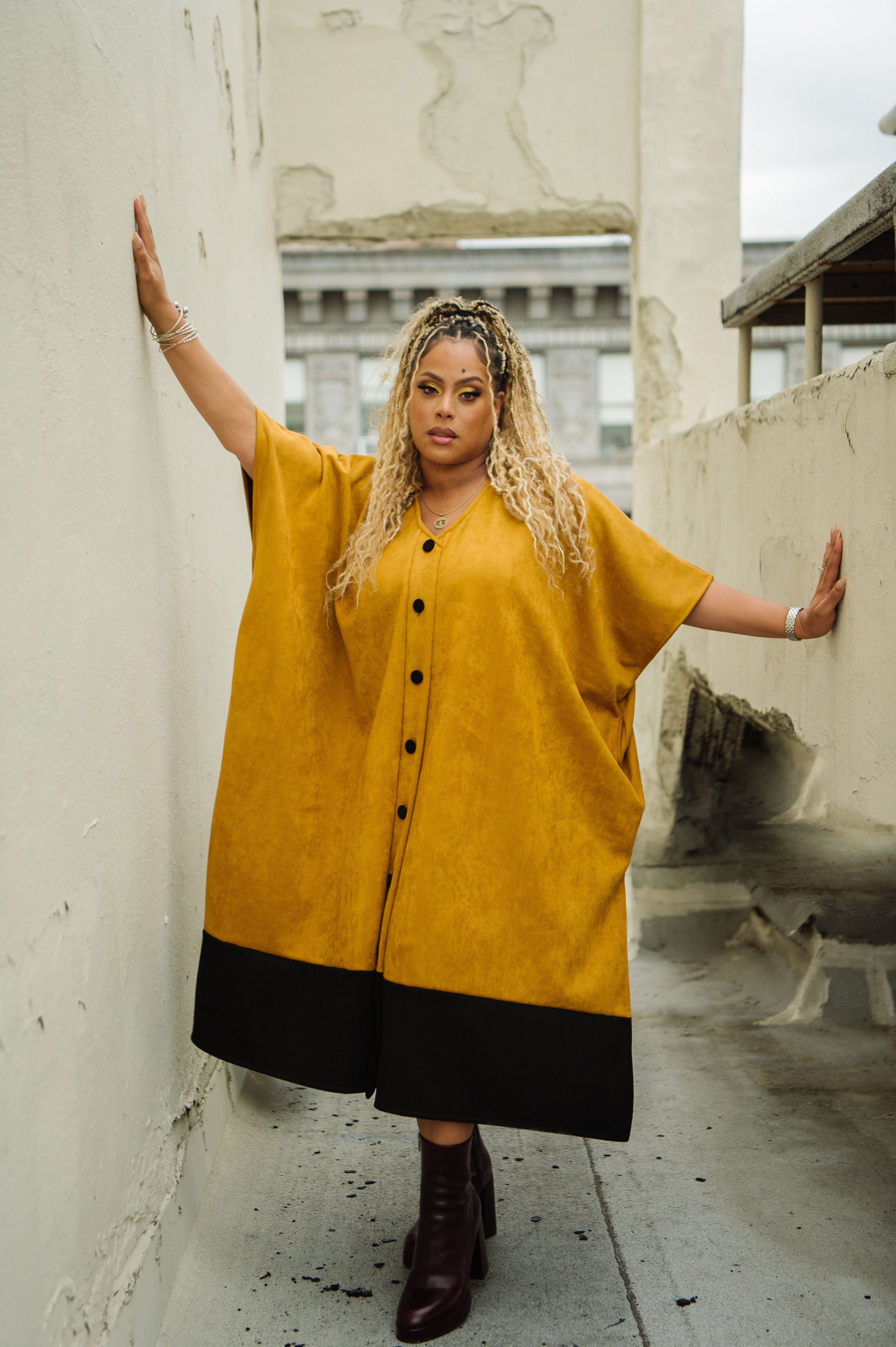 Queen Capricorn features a mustard faux suede body anchored with a bold black hem. Commanding and intentionally oversized. Weighted for the cooler months, finished with oversized buttons, and designed to move effortlessly from home to street. Cozy, elevated, and unmistakably Capricorn.