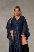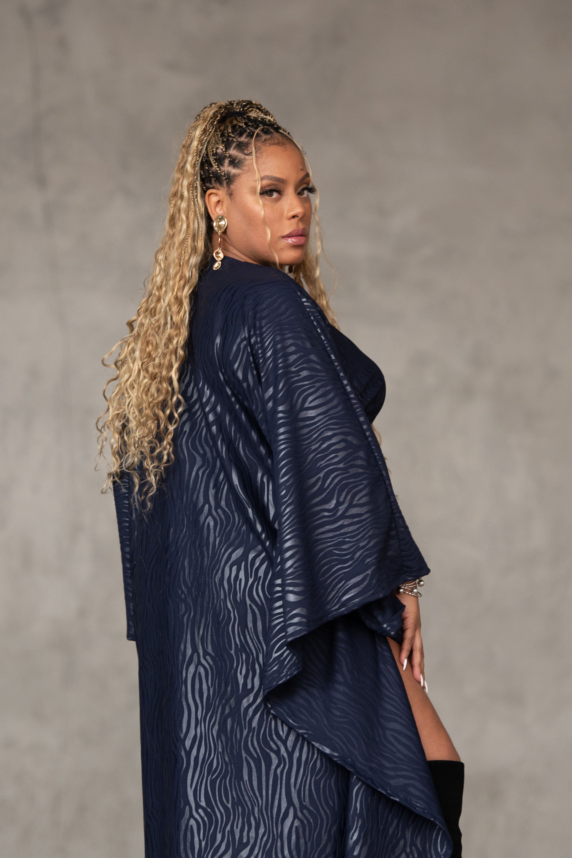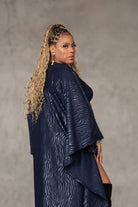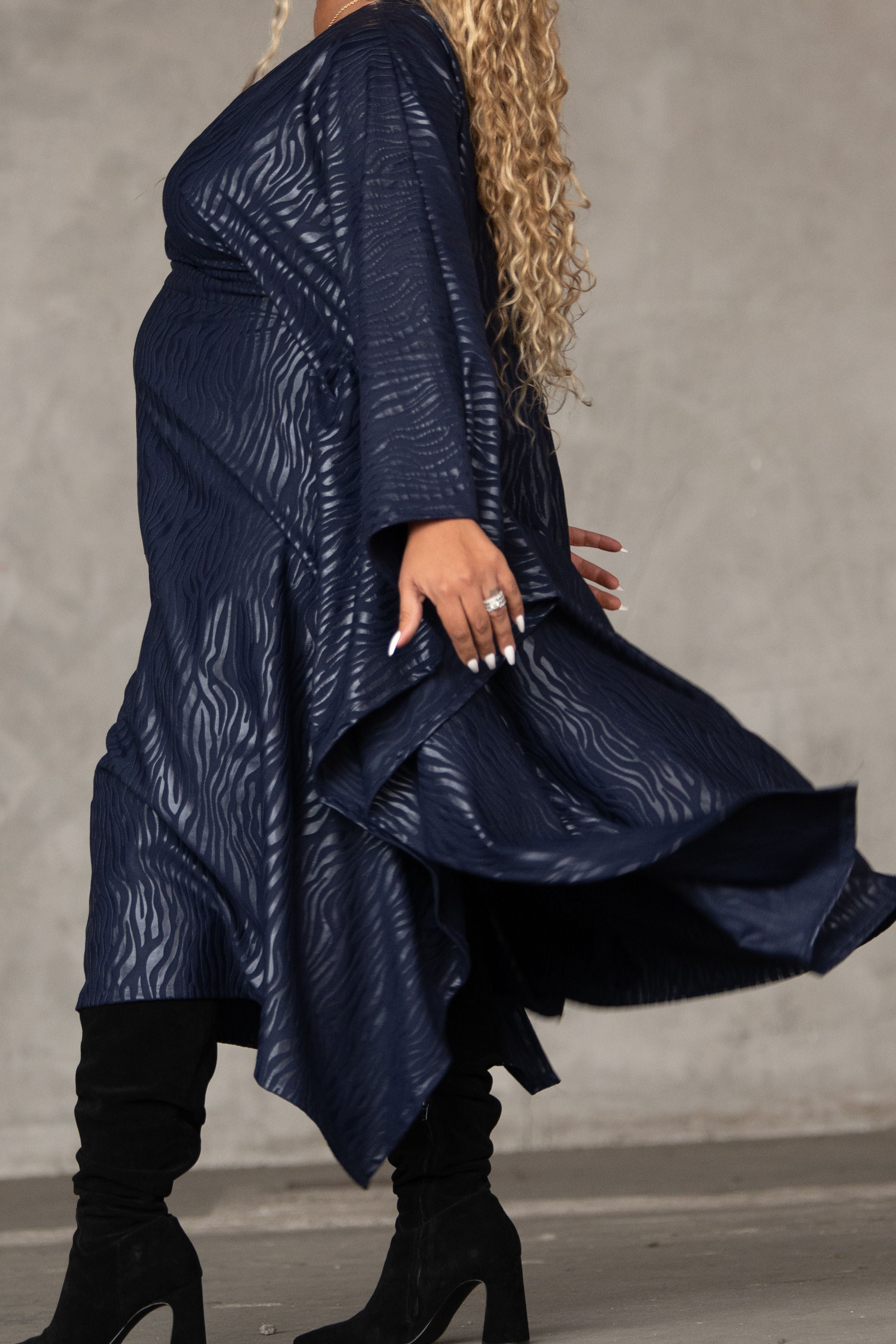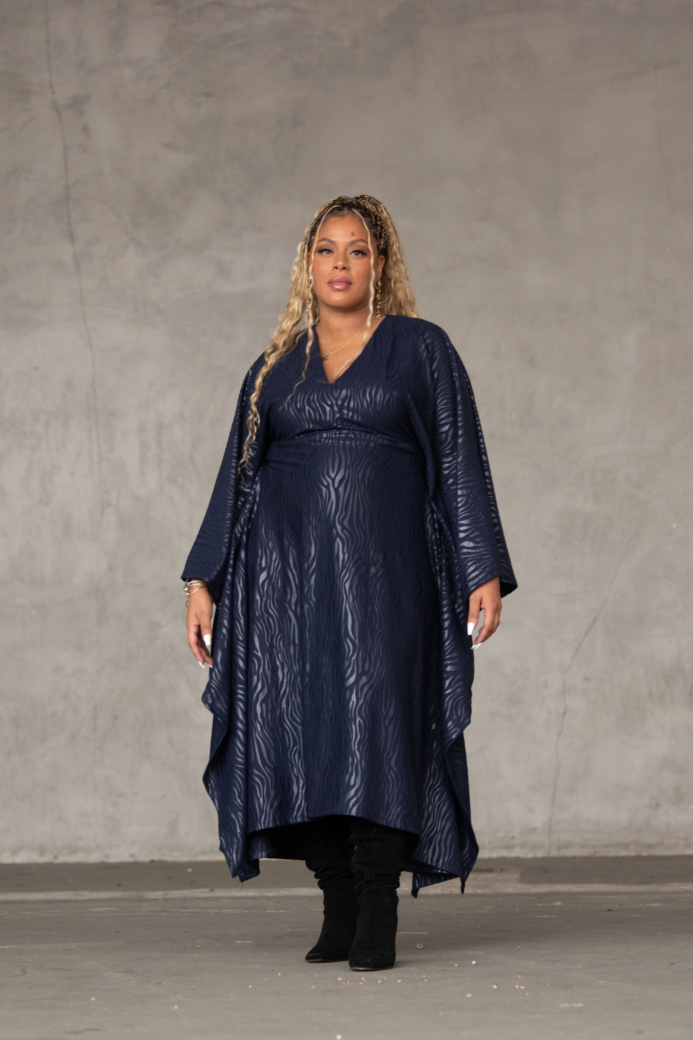 Stand out in this navy blue muumuu with embroidered zebra stripes. The weighted Liverpool fabric adds structure, while the inside belt lets you customize the fit. Bold, unique, and seamlessly chic.