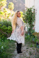 Taupe lace from top to hem drapes in all the right places. The V-neck and belted waist accentuate your curves while sheer panels tease beneath, making this mid-length piece irresistibly bold and daring.