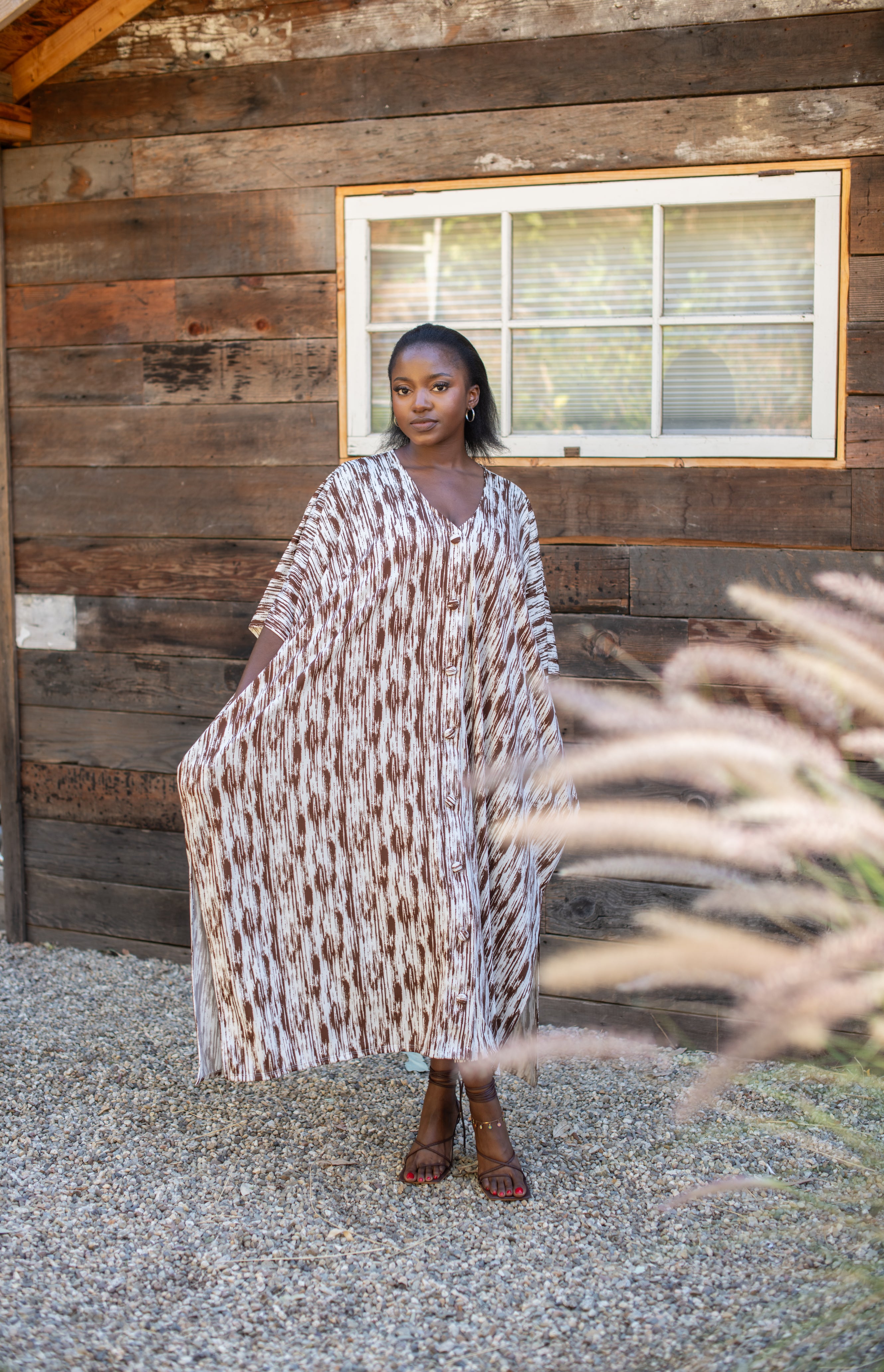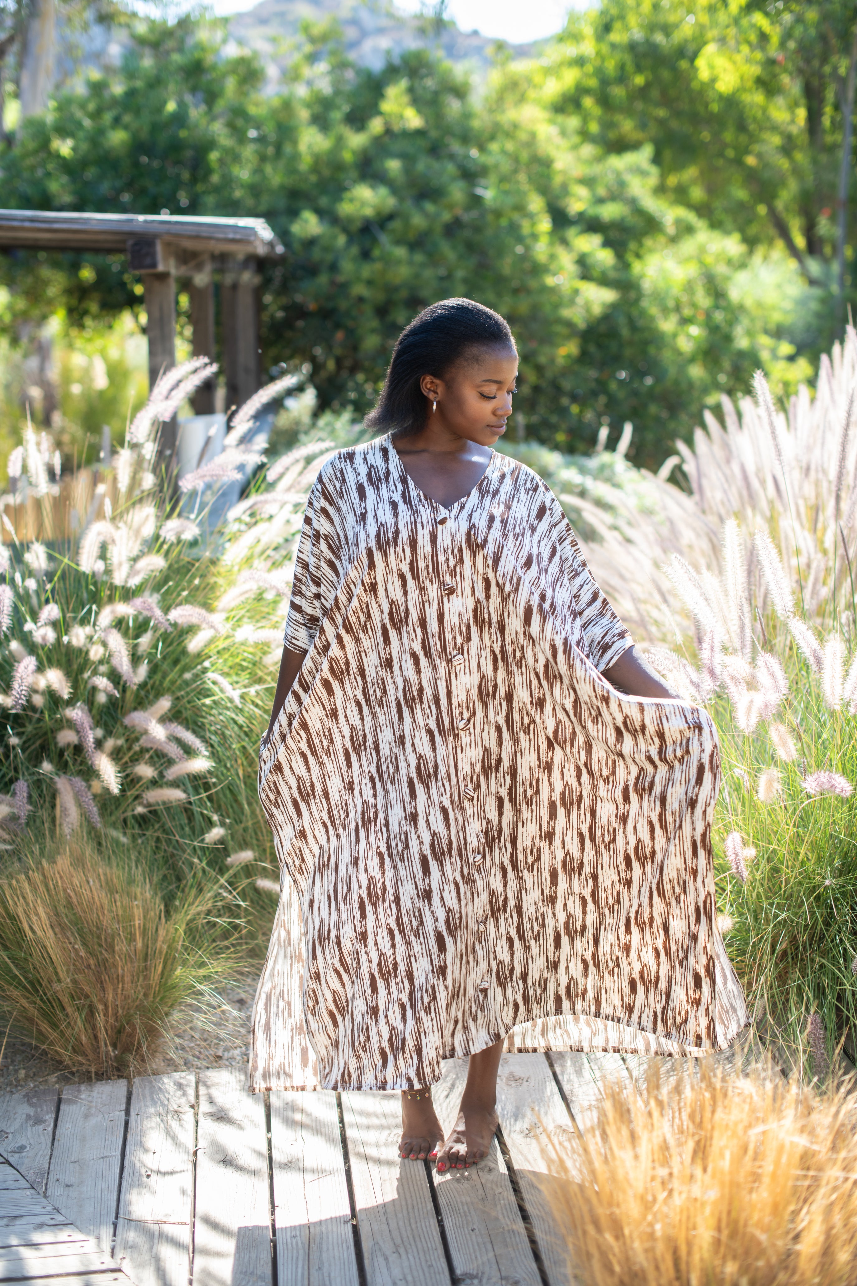 Muuuuuuahhhh, no bras! Under this muumuu if that’s what you like. This is Mocha Kiss—brown and off-white, buttoned down with effortless style. Pockets to keep your essentials close, and a loose, flowy fit that muuvs with you.