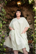 Meet your summer muse. This mint-hued muumuu is made for PTO days with a mojito in hand. Designed with vertical linework and an airy silhouette. The wind will blow right up your muumuu all summer long. Resort-ready, effortlessly cool, and pockets to stash your eyelashes when you rip em off.