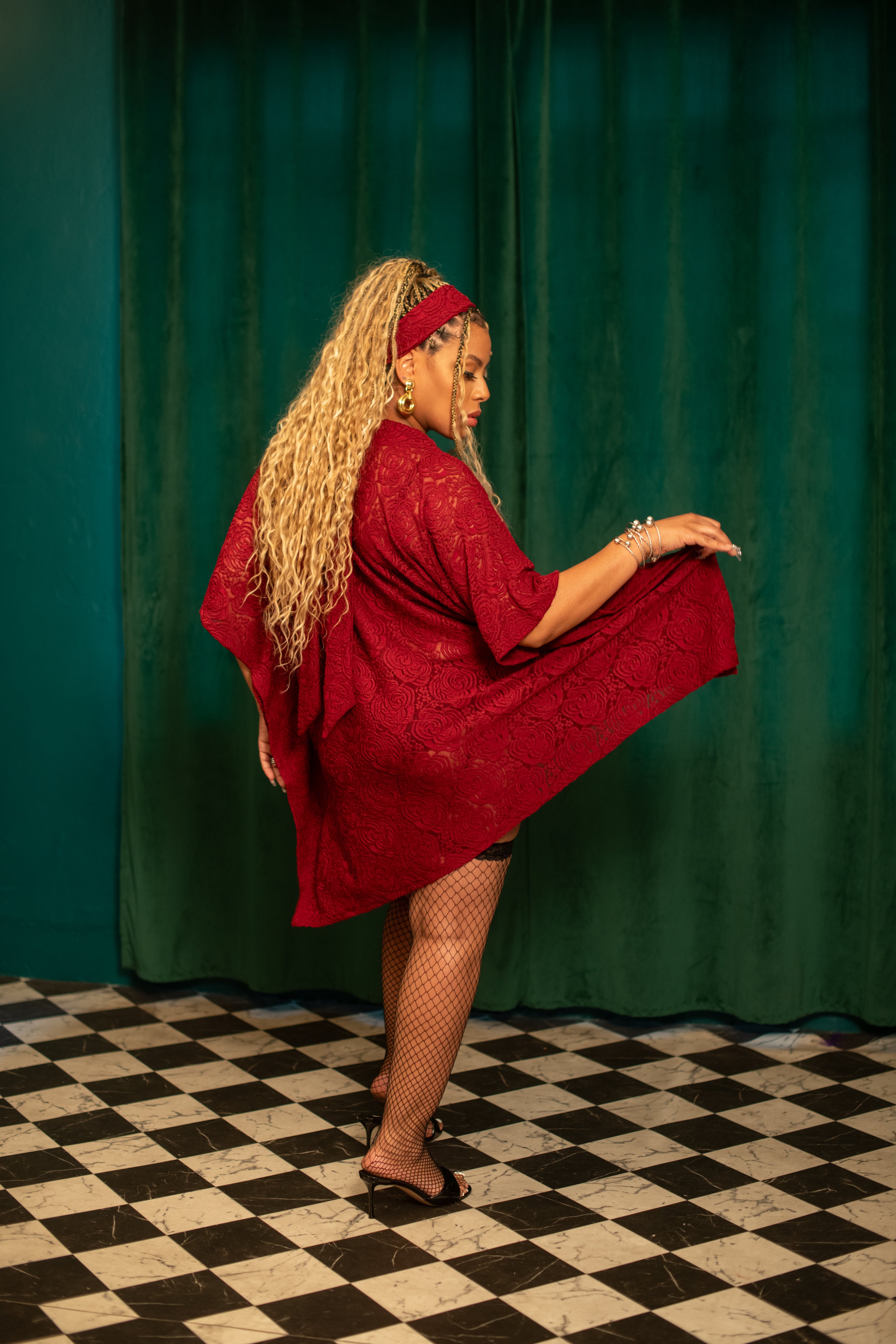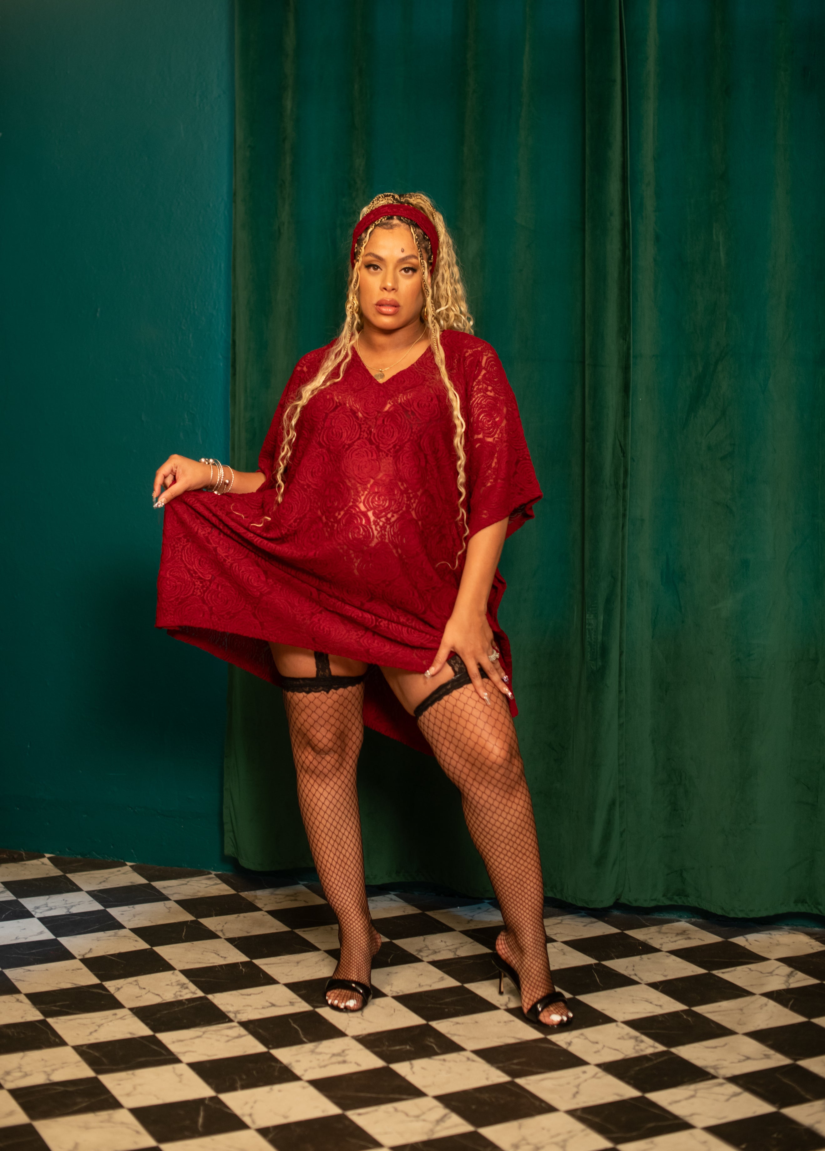 Scarlet Rose is ready for whatever adventure you have in mind. This deep red sheer lace muumuu, with rose embroidery and a flirty short length, comes with a detachable belt that you can style however you like—wrap it around your waist, wear it as a head tie, or even use it as a blindfold for some fun.