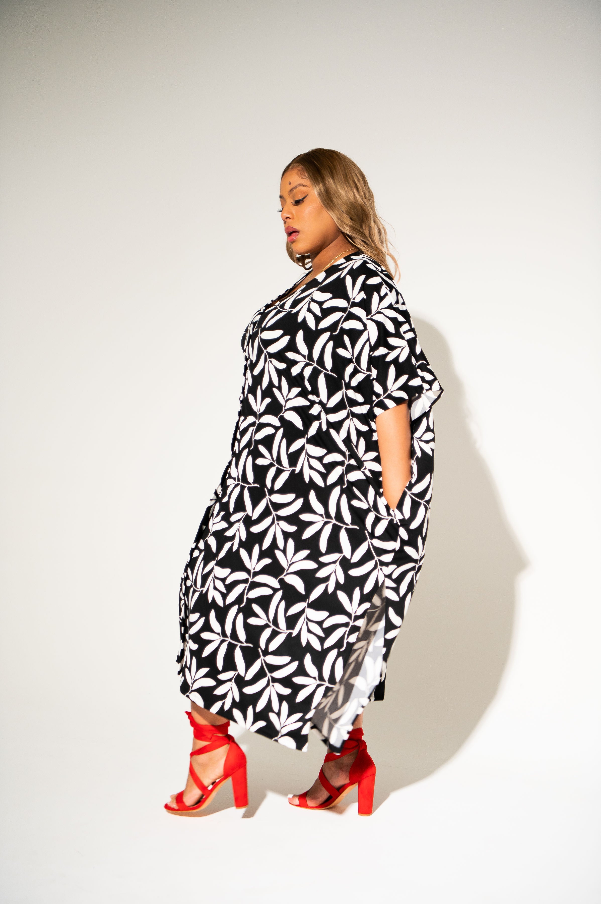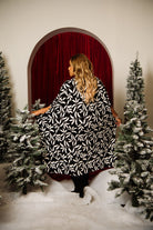 Meet Sleigh Me Out, the muumuu made for sipping holiday cocktails and causing just the right amount of trouble. This flowy black beauty with a white leaf print drapes like a dream, and the button-down front plus pockets make it perfect for sneaking in mistletoe or stashing your favorite seasonal sips. However you style it, this one was made to sleigh you out!