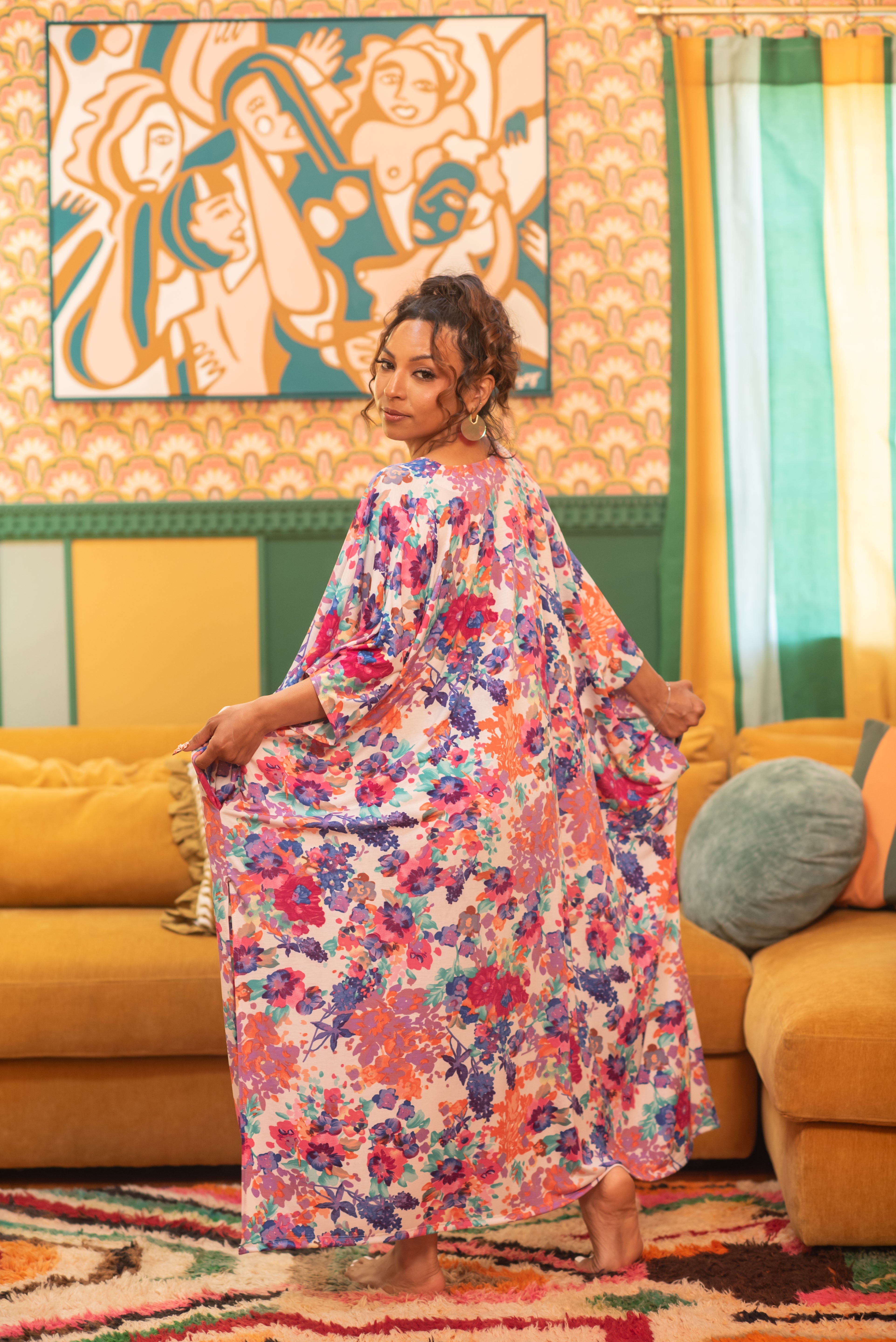 A soft spring floral muumuu with a flattering V-neck and deep pockets for whatever you’re carrying—lip gloss, love notes, or a little attitude.